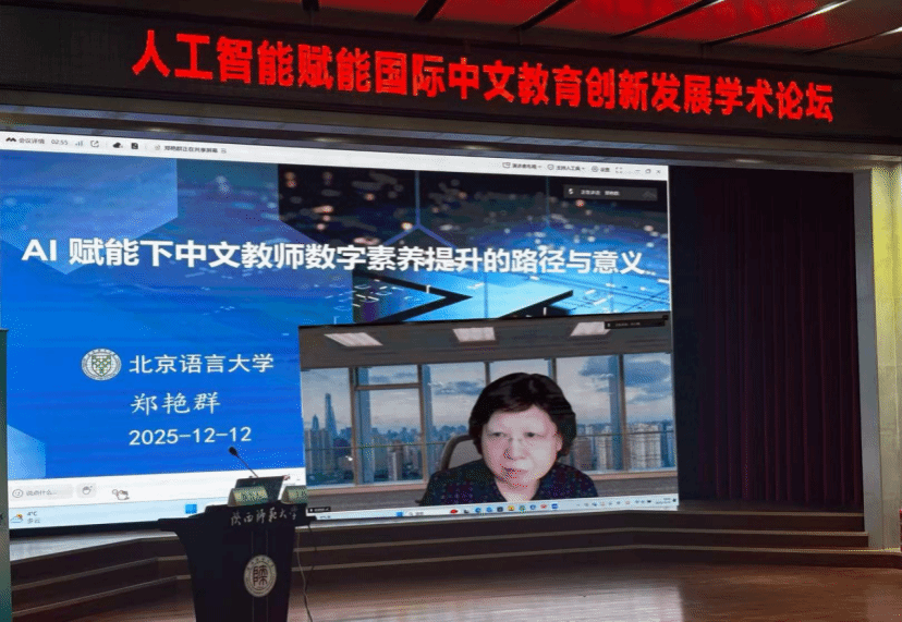郑艳群教授以《AI赋能下中文教师数字素养提升的路径与意义》为题进行报告,基于《国际中文教师数字素养参考框架(2025)》,探讨 AI 赋能下数字素养提升的主要路径,包括技术理解、多模态资源应用、智能教学设计、学习数据分析与基于证据的教学改进。郑教授强调,AI不仅可以改变教学工具,更将重塑中文教师在语言理解、跨文化沟通和技术伦理中的专业角色。