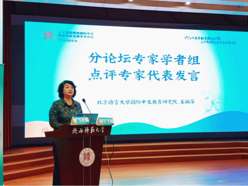 姜丽萍教授以《人工智能赋能国际中文教育语音教学资源建设与应用》为题进行报告,站在人工智能技术应用的视角,聚焦国际中文教育语音教学资源的建设与实践,探讨了四个方面的内容:其一,剖析人工智能技术带来的教学理念转变,明确技术赋能下“以学习者为中心”的教学导向;其二,提出数字化国际中文教学资源建设四大特征:资源建设一体化、学习内容模块化、学习过程交互化和学习评价过程化;其三,结合语音教学场景,具体展示AI驱动的语音资源库建设路径及其在发音训练、实时评测中的应用实践;其四,探讨新形势下国际中文教师的能力发展方向,包括AI工具应用、语音资源整合与个性化教学设计等核心素养提升。