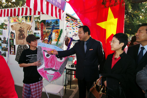 上午9时30分,房喻校长等校领导首先陪同来访嘉宾一行来到雁塔校区办公楼前参观了陕西师范大学国际交流回顾展览,体验了师大外国留学生“国际风情展”,并为我校首届“国际文化节”的开幕签名寄语。“国际交流回顾展览”以展板形式生动翔实地介绍了我校近年来国际交流与合作方面的发展状况及所取得的进步。“国际风情展”展台前各国国旗飘扬、民族舞姿飘逸、异域美食飘香,在我校留学的来自30多个国家的外国学生集中在此展示各自国家的文化风情。现场气氛热烈,国际化氛围浓厚。中外嘉宾时而驻足观看我校外国留学生独具魅力的民族舞蹈、时而欣赏彰显不同国度文化特色的民俗风情展示、时而品味他们亲手制作的异国风味,并与参展的各国留学生亲切交谈,热情合影。来访客人在体验之余不断称赞我校“国际风情展”独具魅力,参与性高,吸引力强,为国际文化节营造了独特的欢快氛围。