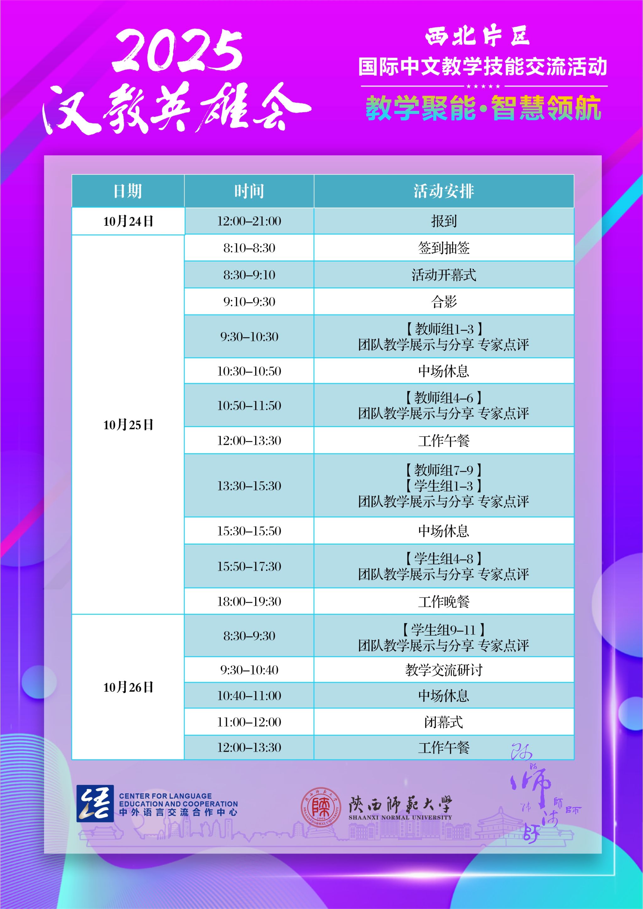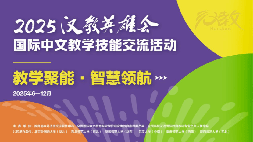 由教育部中外语言交流合作中心、全国国际中文教育专业学位研究生教育指导委员会、全国高校汉语国际教育本科专业负责人联席会联合举办,陕西师范大学承办的2025年“汉教英雄会”国际中文教学技能交流活动(西北片区)将于2025年10月24日-26日举办。届时将有9支教师团队、11支学生团队进行教学展示与分享,诚邀各校师生观摩、交流!