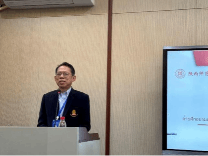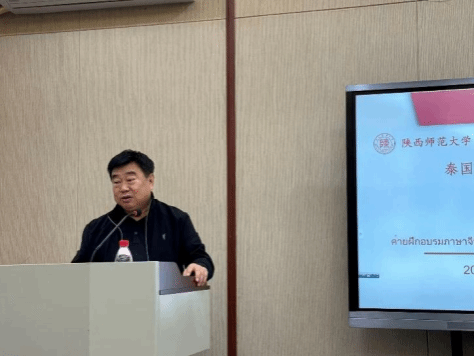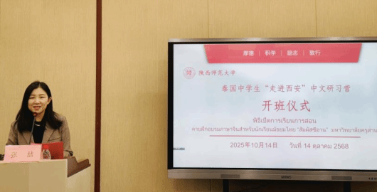 国际汉语文化学院院长石洛祥致欢迎辞。他回顾了陕西师范大学的悠久历史与办学成就,介绍了学院在国际中文教育方面的发展情况,并对远道而来的泰国师生表示热烈欢迎。石院长希望同学们在西安这座历史文化名城中,沉浸式学习中文、感知中华文化。