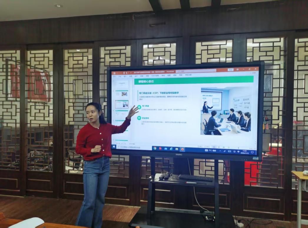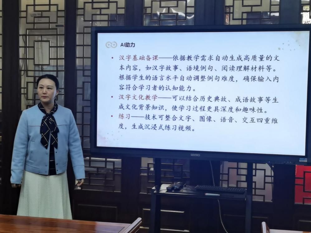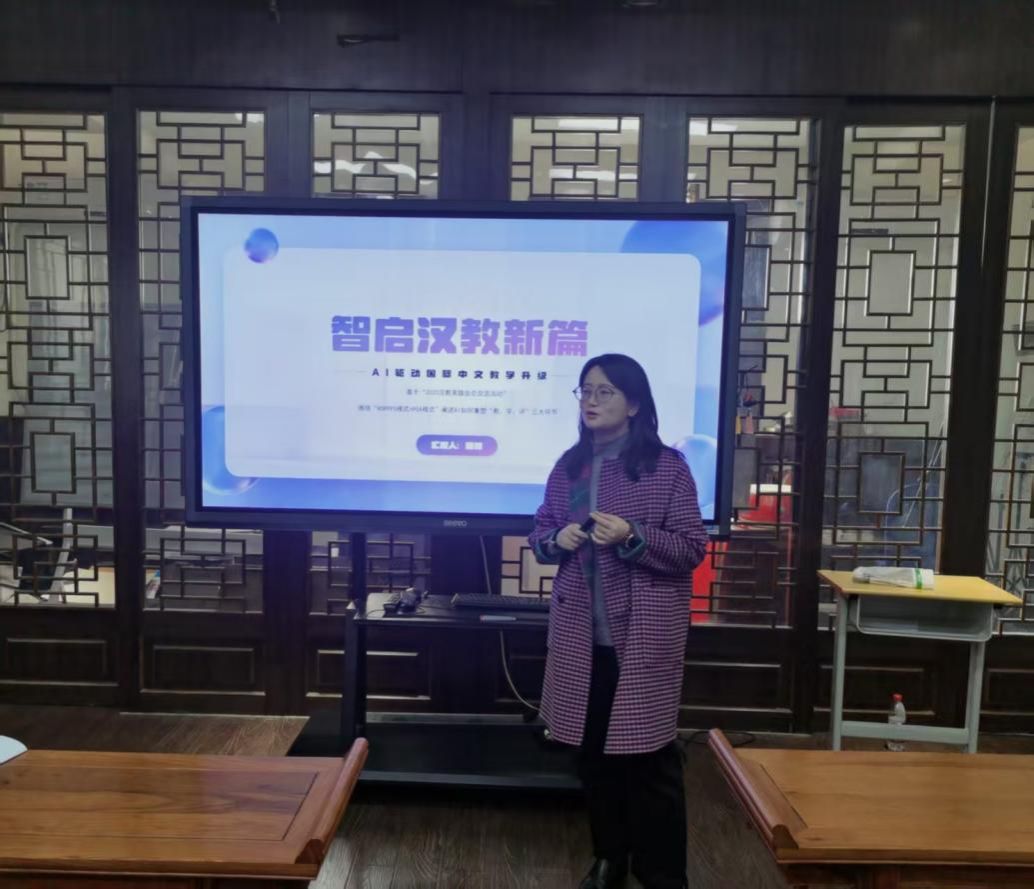 活动伊始,科大讯飞高级工程师刘新宇带来了国际中文智能教学系统的专题培训。她从系统核心功能、操作流程、教学适配场景等方面进行了细致讲解,结合具体案例演示了系统在资源生成、互动教学、学情分析等环节的应用优势,帮助在场教师快速掌握了智能教学工具的使用方法,为后续教学实践奠定了坚实的技术基础。